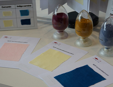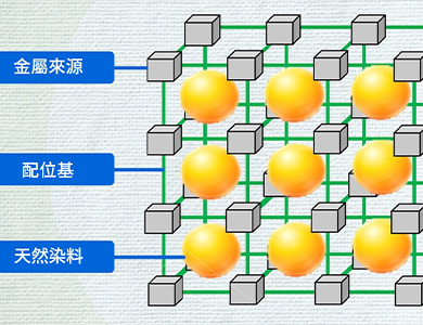 此方法利用金屬有機框架 (MOFs)令織物表面功能化,有效為棉織物染色。首先,將織物浸入含金屬離子和配體離子溶液的超聲波浴或浸軋機中,使這種由金屬離子和配體組成的多孔化合物在織物表面形成。隨後,將功能化的織物在水浴中以天然染料染色,MOF孔的大小可改變,以便吸附不同類型的染料。因此,無需使用媒染劑便能加強染料吸收。